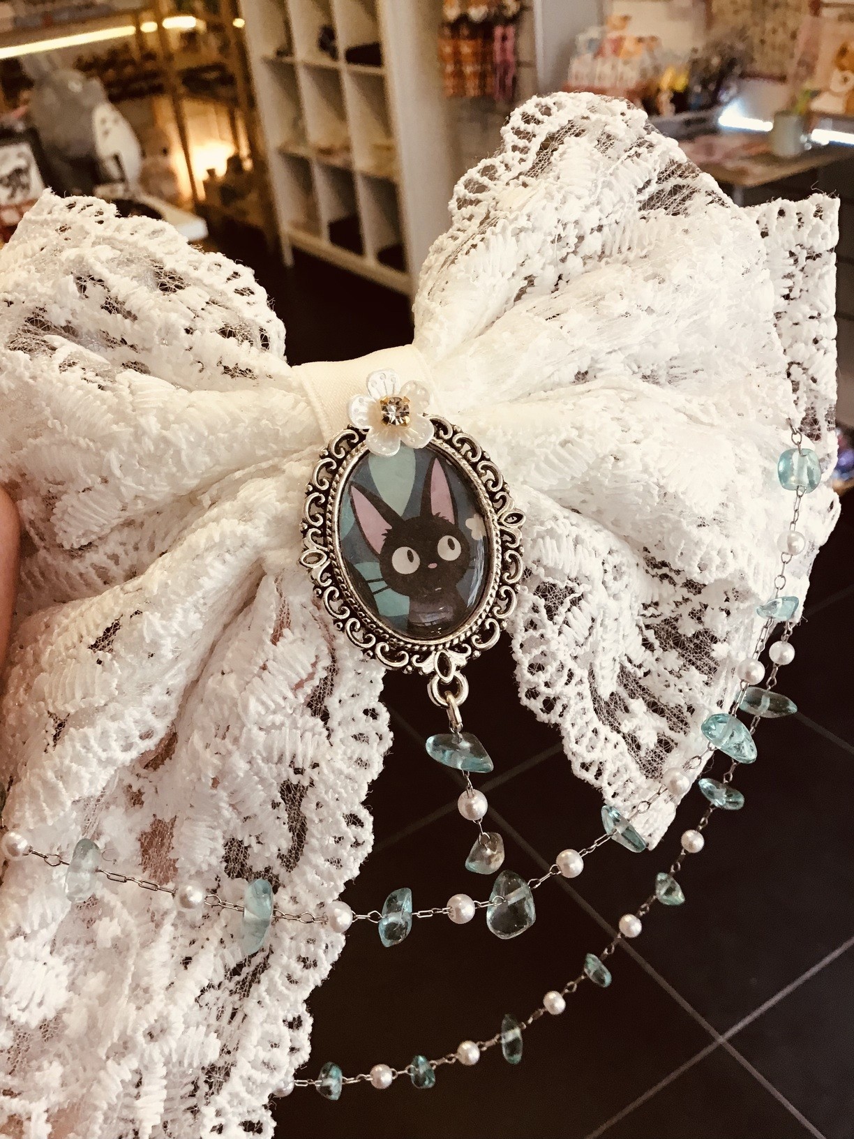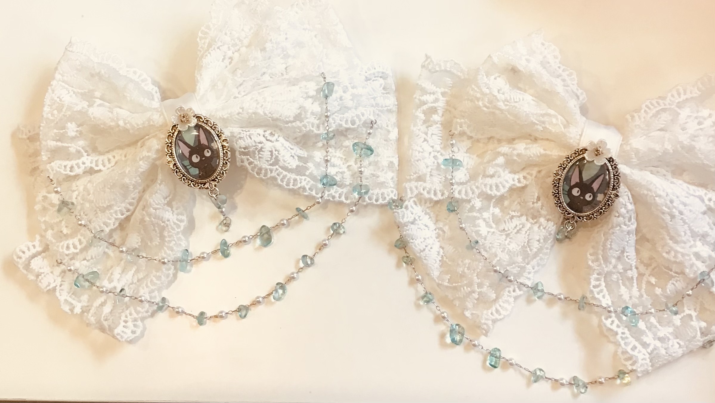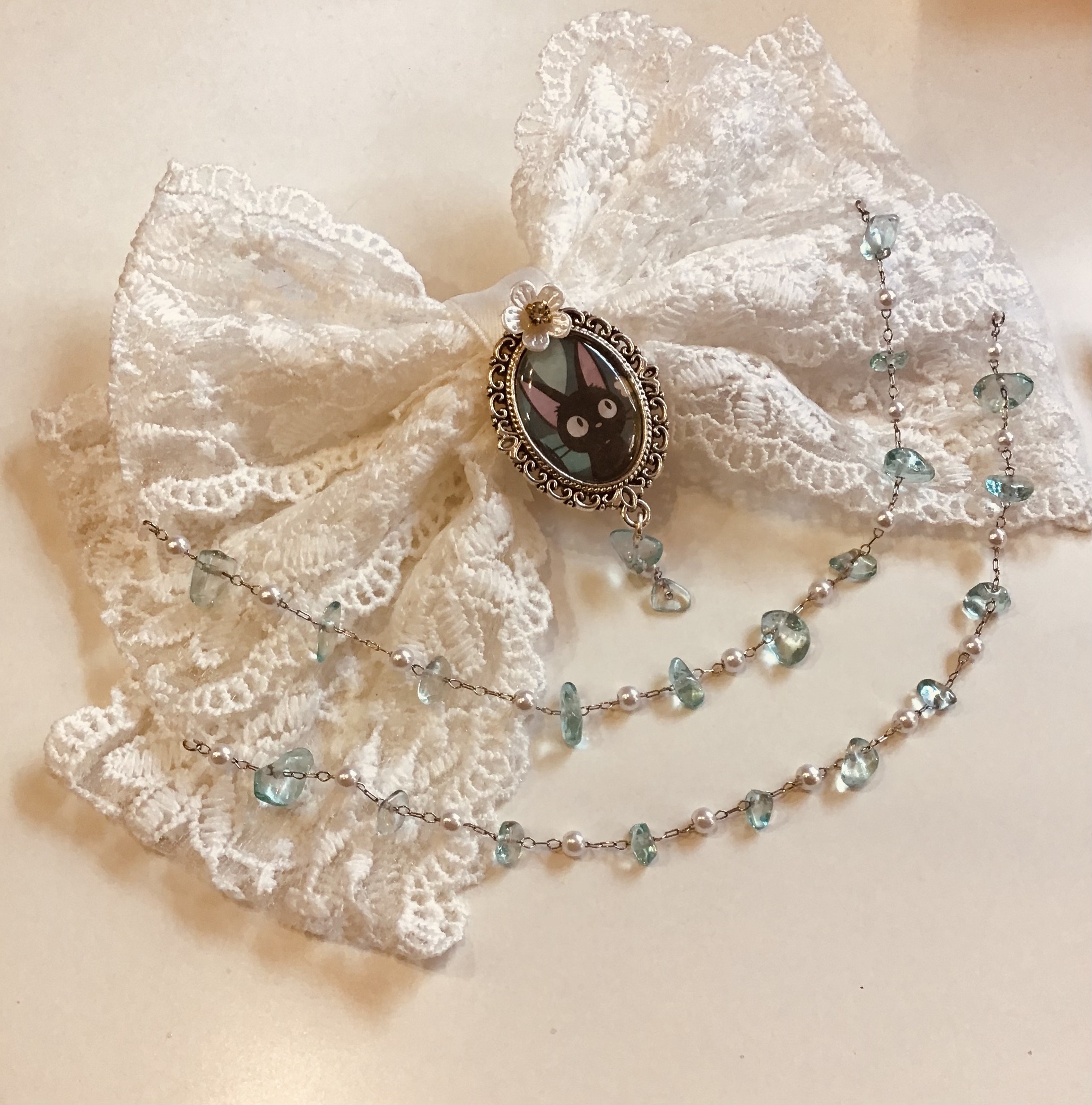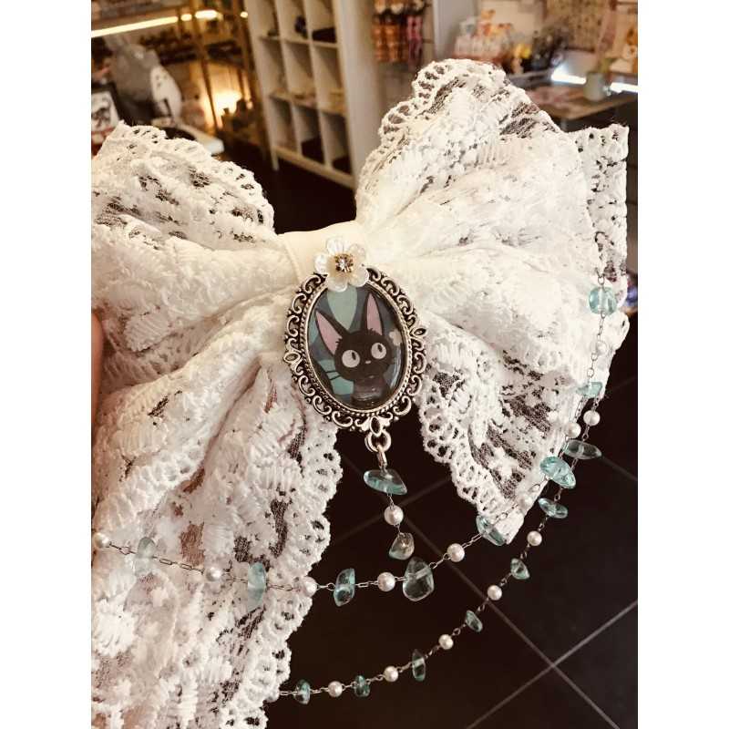 Elegant and kawaii, this large clip is decorated with white lace, a silver Jiji medallion, and a delicate chain of white and blue pearls.