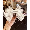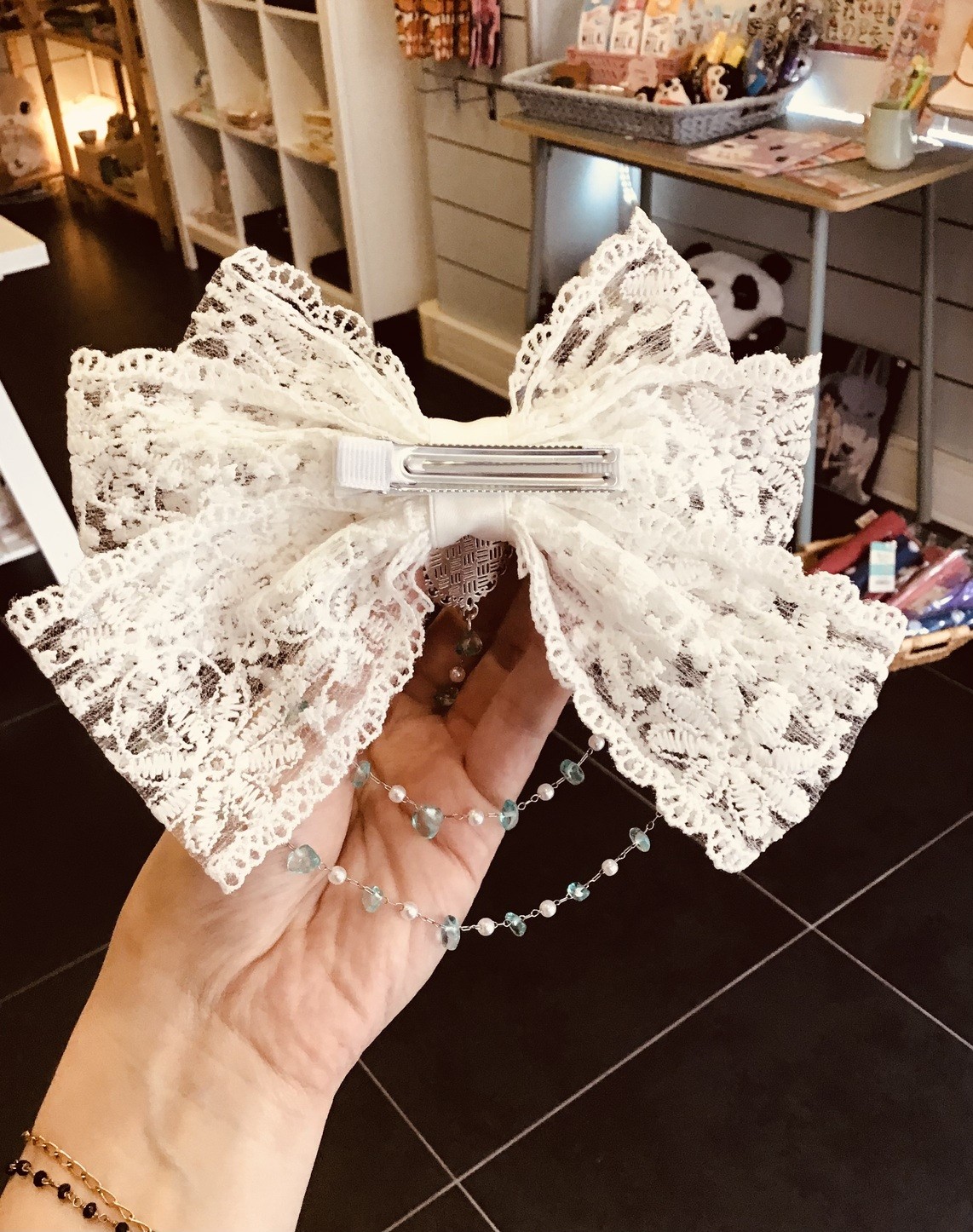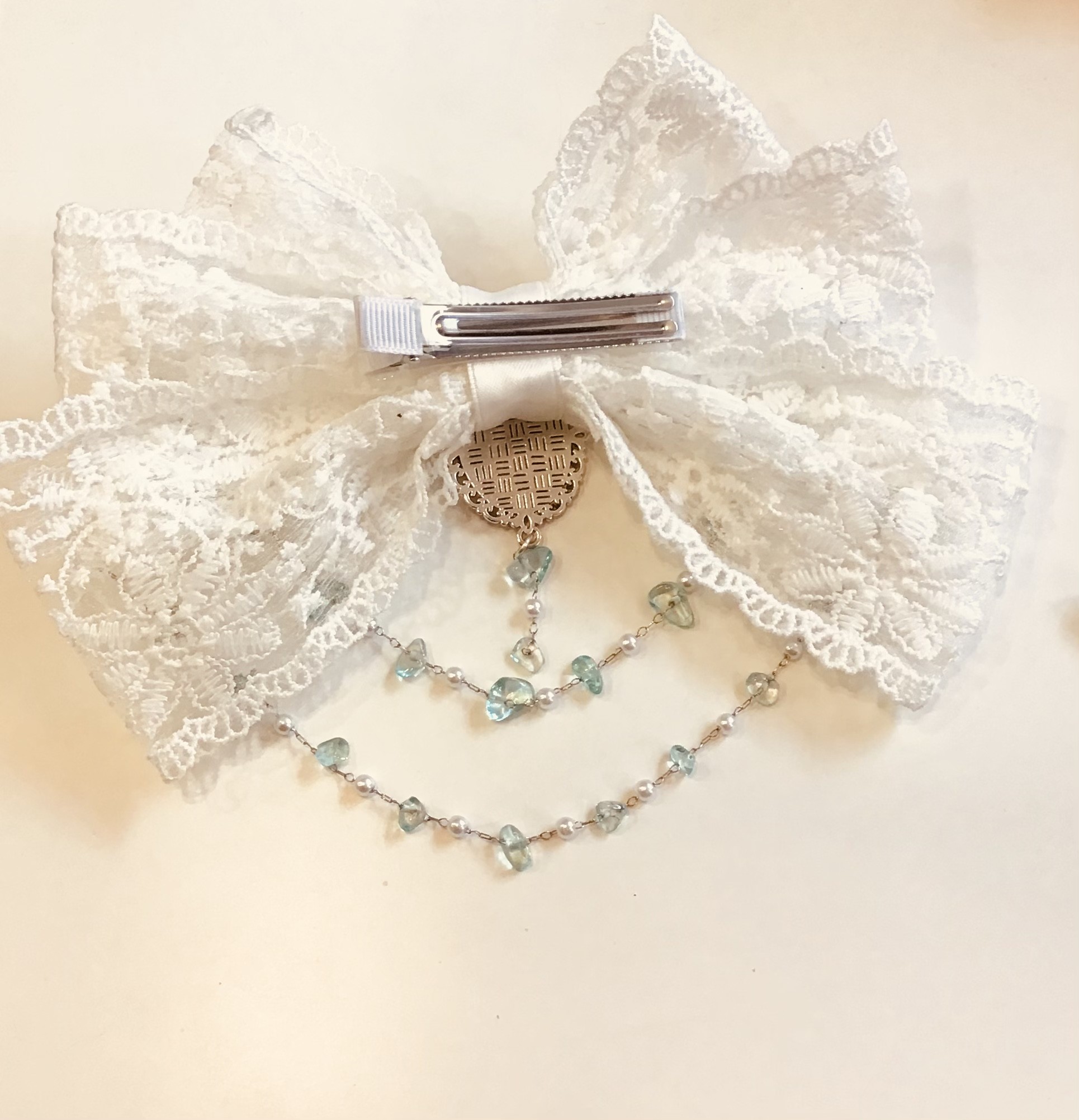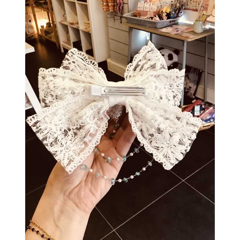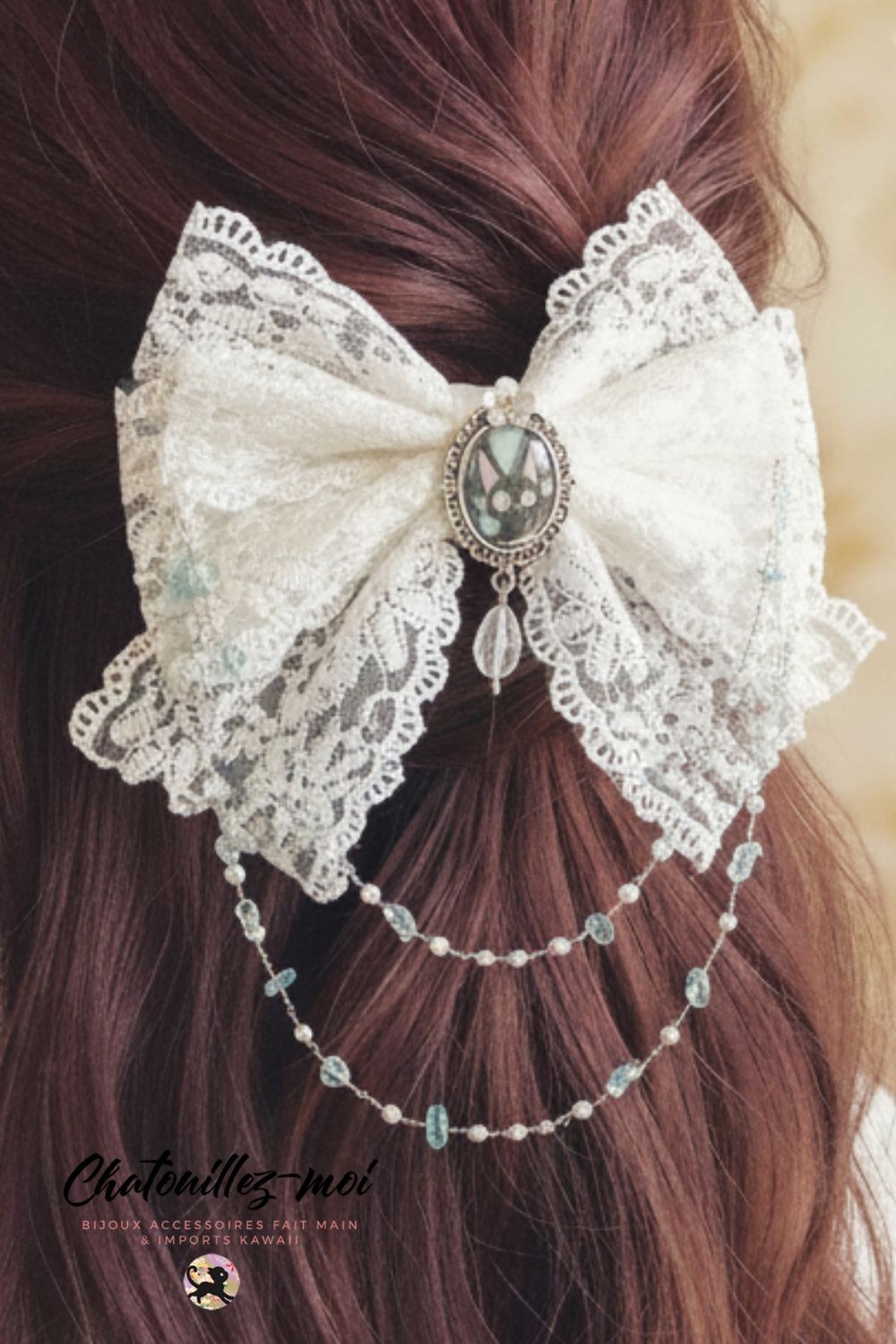 Elegant and kawaii, this large clip is decorated with white lace, a silver Jiji medallion, and a delicate chain of white and blue pearls.