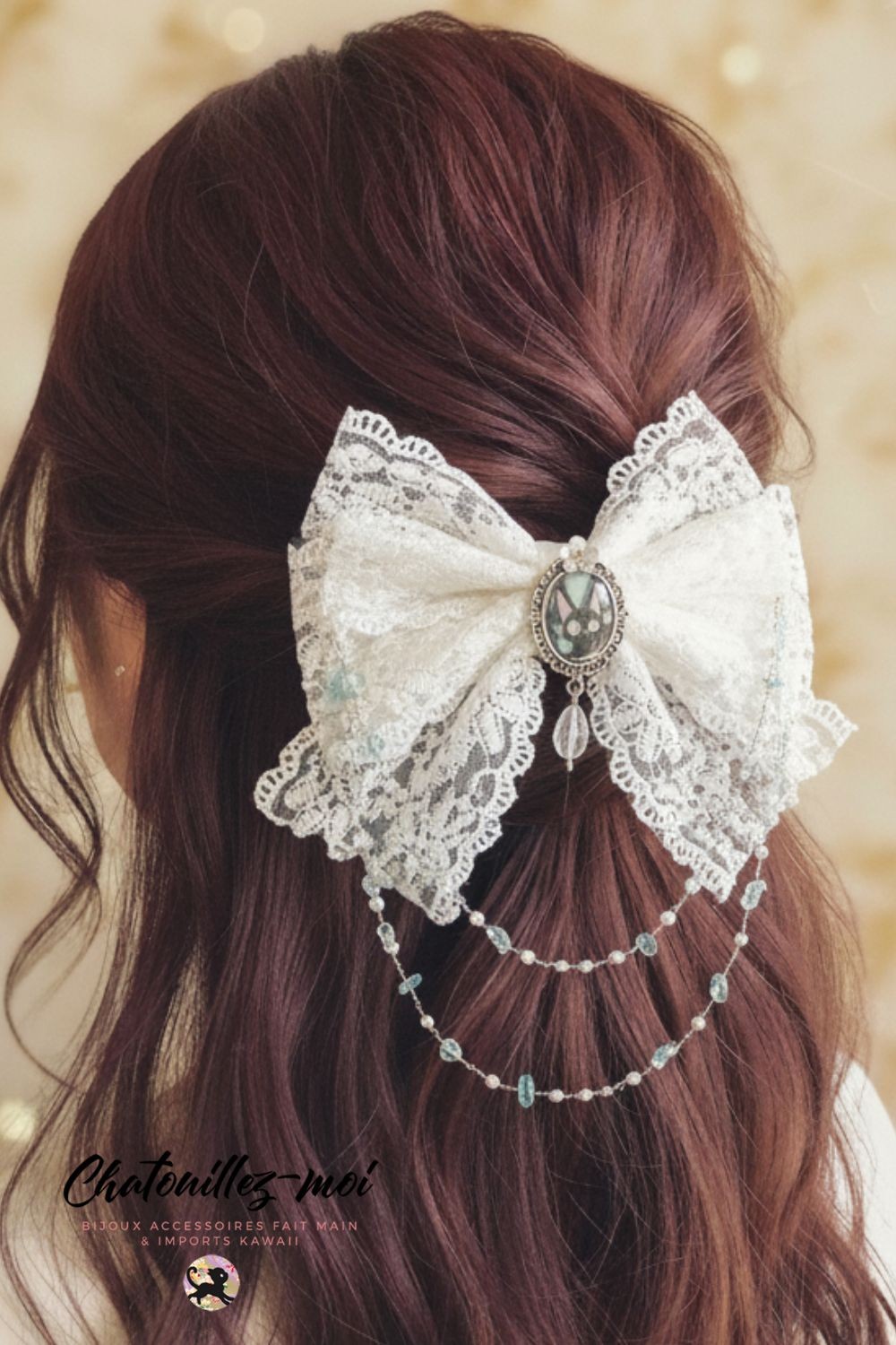 À la fois élégante et kawaii, cette grande barrette blanche est ornée de dentelle, d’un médaillon argenté de Jiji, ainsi que d’une chaînette de perles blanches et bleues. Elle sublime toutes vos coiffures avec délicatesse.