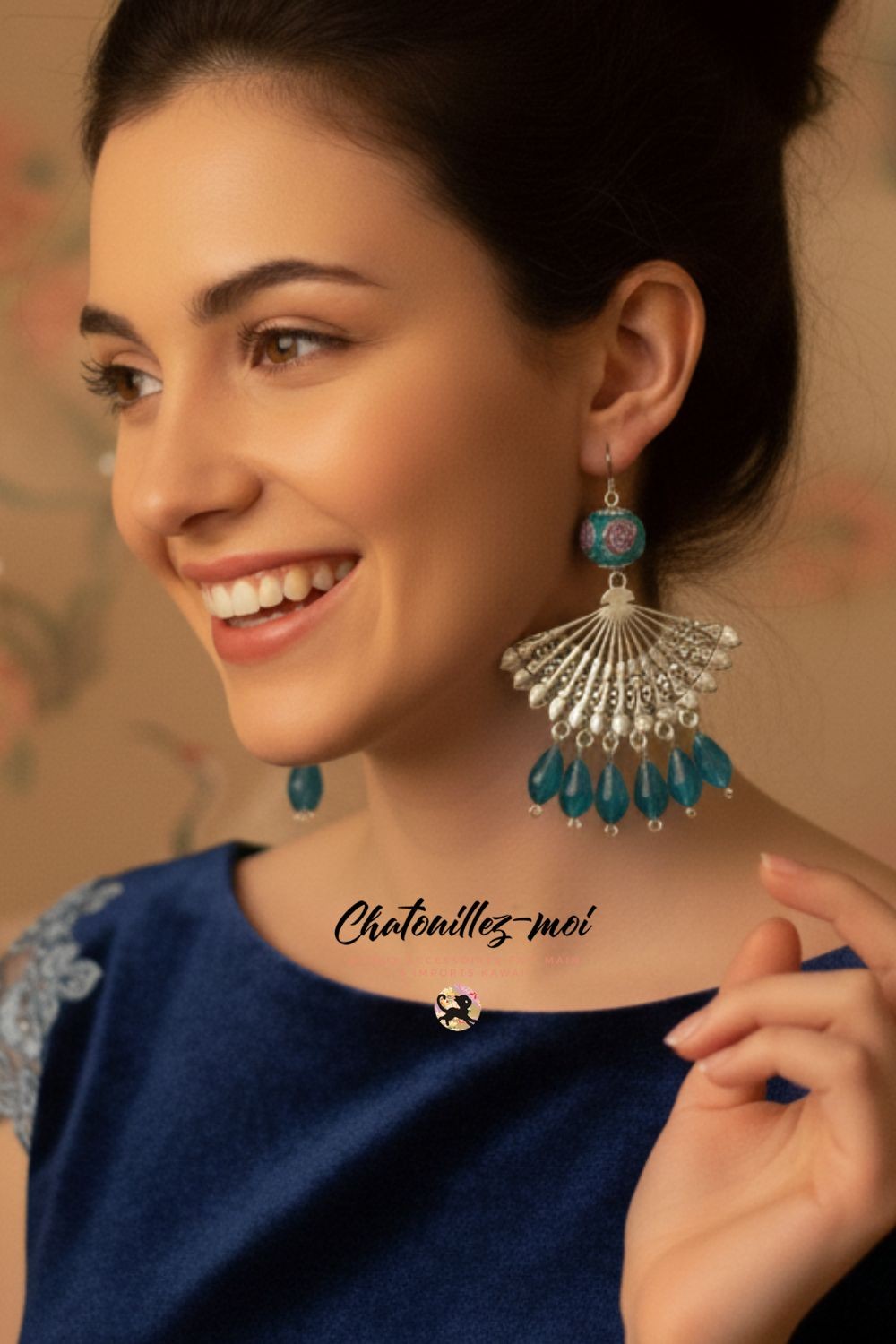 Ces boucles d’oreilles associent un éventail en métal argenté à des perles bleues en verre, créant un bijou raffiné et original. Les crochets en acier inoxydable assurent confort et sécurité. Attention : ces boucles sont un peu lourdes, à porter avec soin.