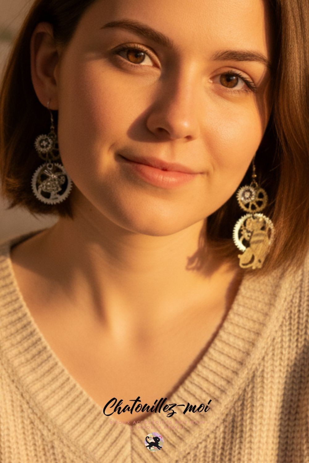 Boucles d’oreilles Lapin et Chat Cheshire – Style Alice Steampunk en métal bronze