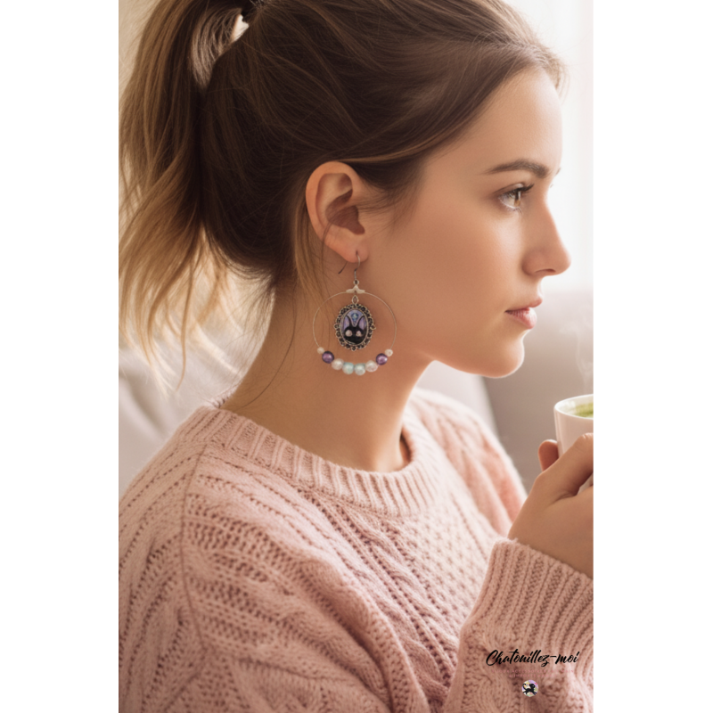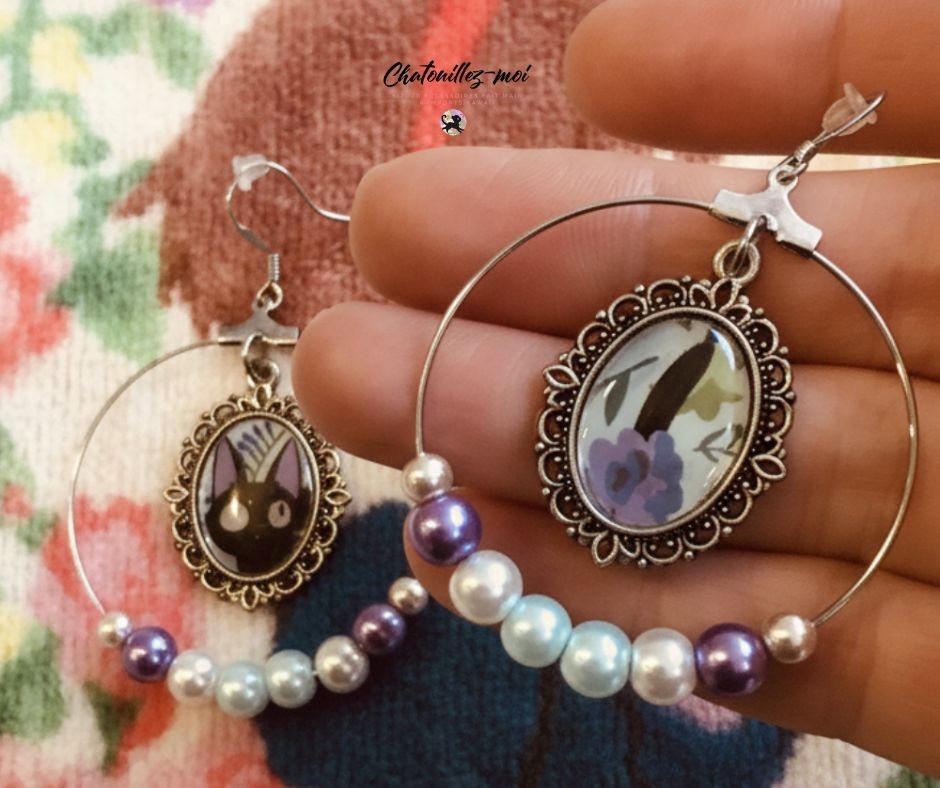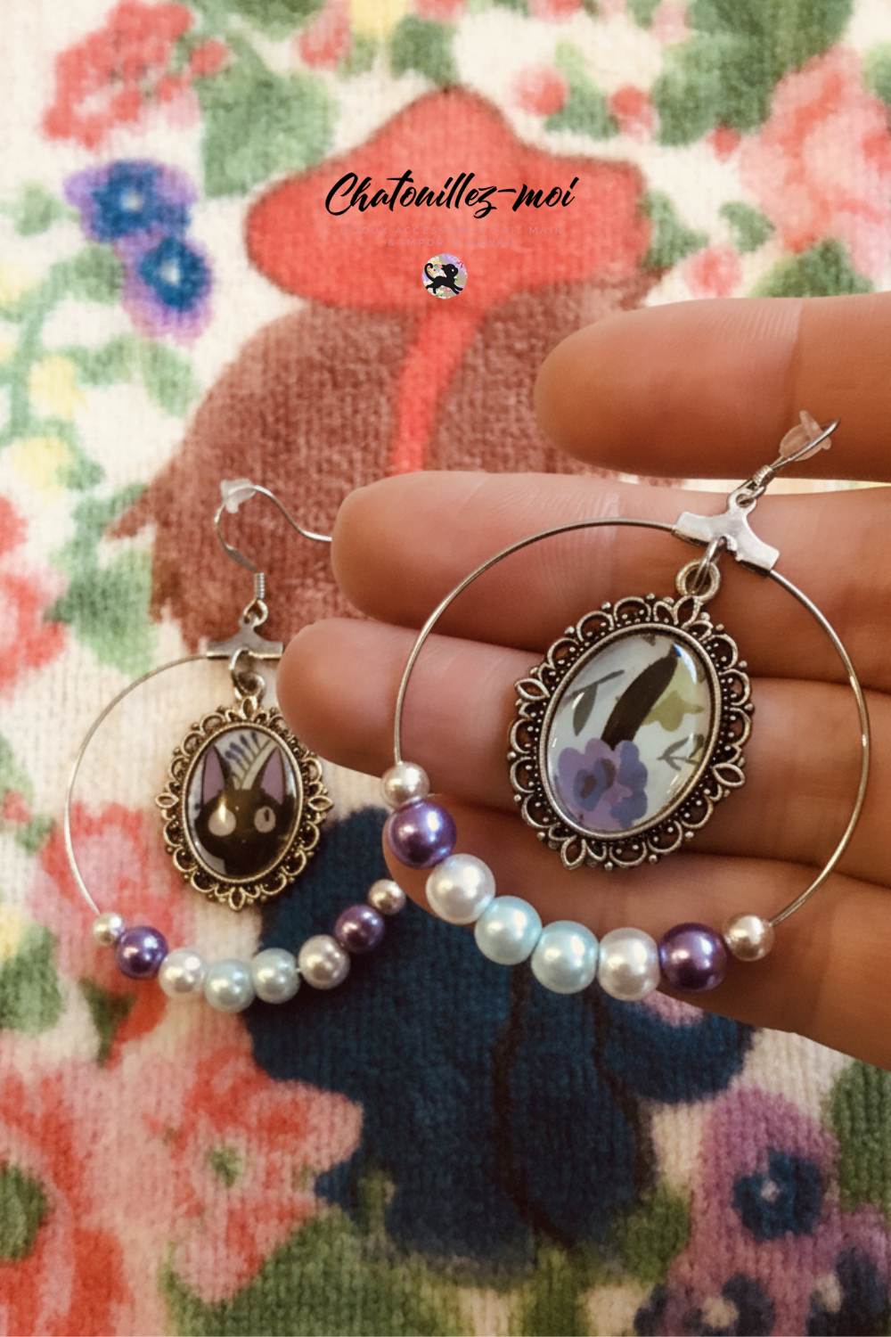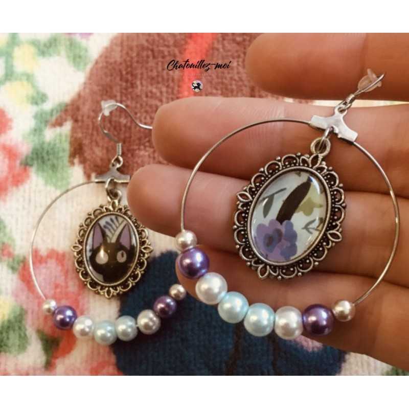 🌙 Silvery creole earrings featuring Jiji, Studio Ghibli’s iconic black cat
