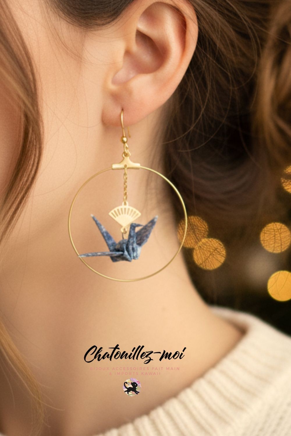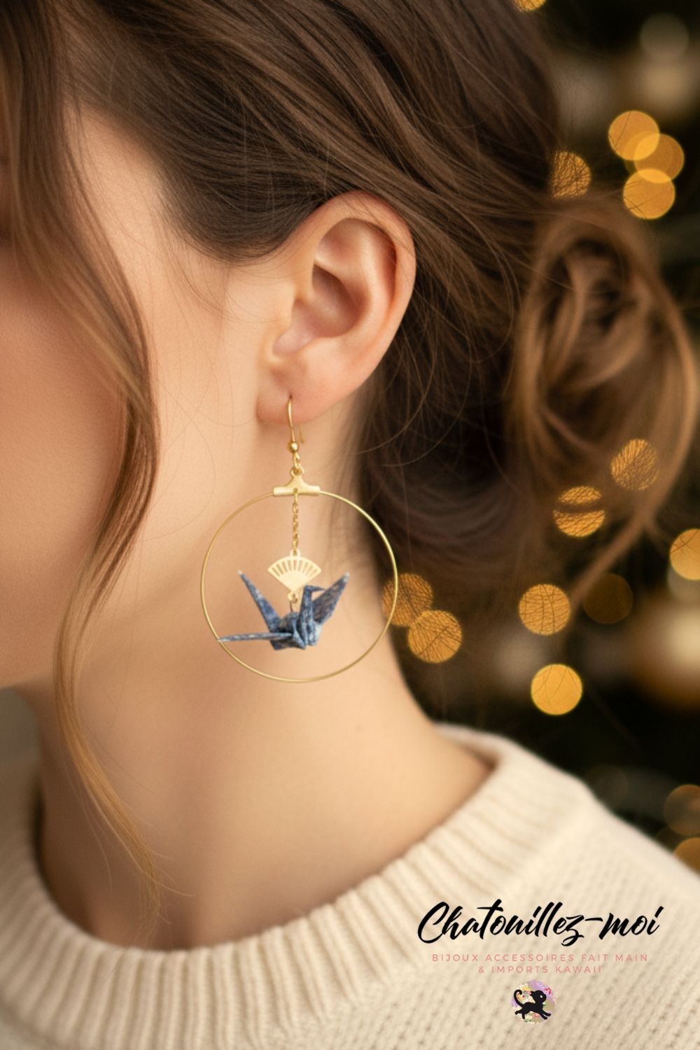 ✨ Boucles d’oreilles créoles en métal doré avec grue en origami japonais