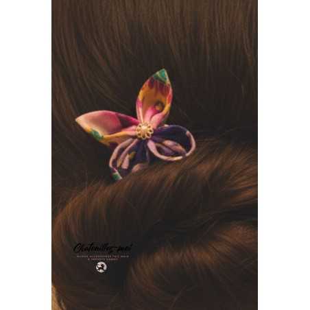 Matériaux : métal bronze, résine, tissu japonais Sakura bleu, origami en papier/tissu