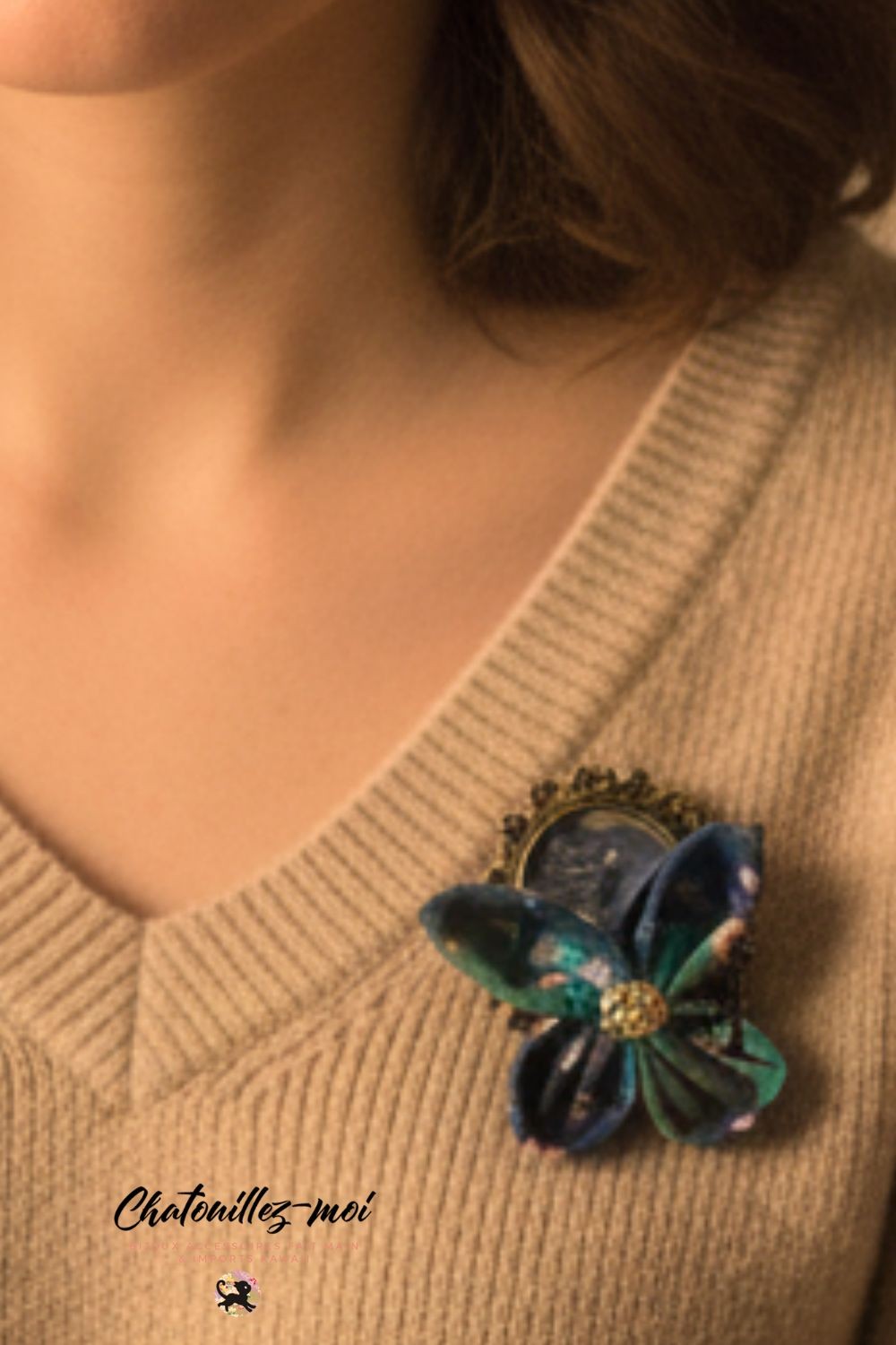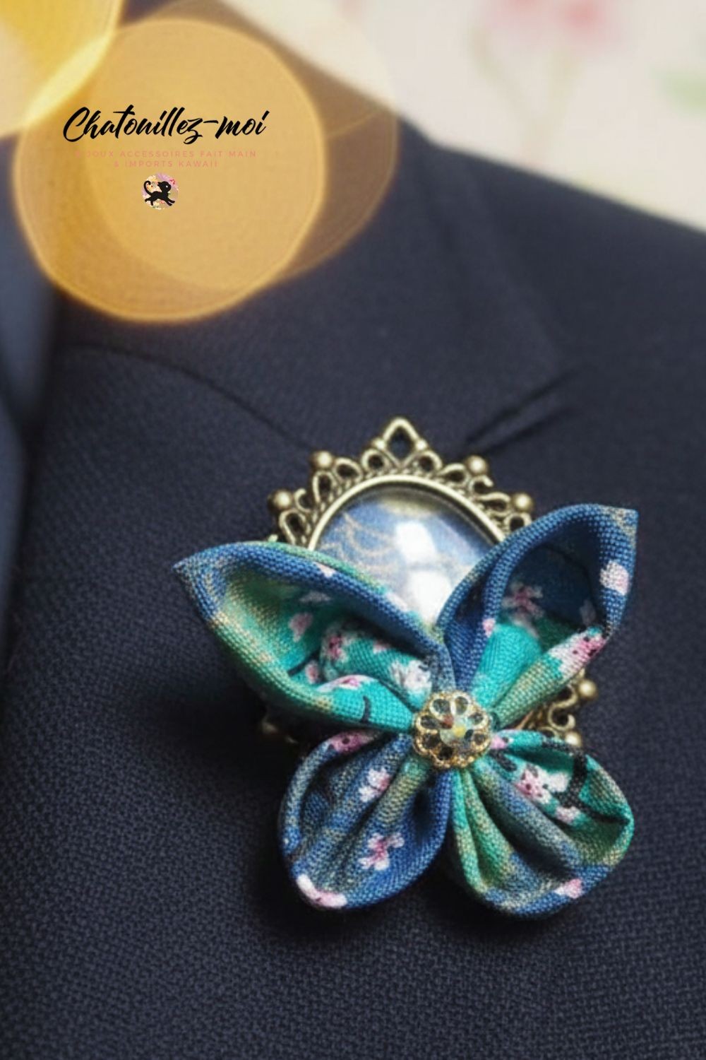 This beautiful bronze-colored metal brooch features blue Sakura Japanese fabric set under resin, enhanced with a finely folded origami butterfly. Every element is crafted with care, making this piece a truly unique creation.