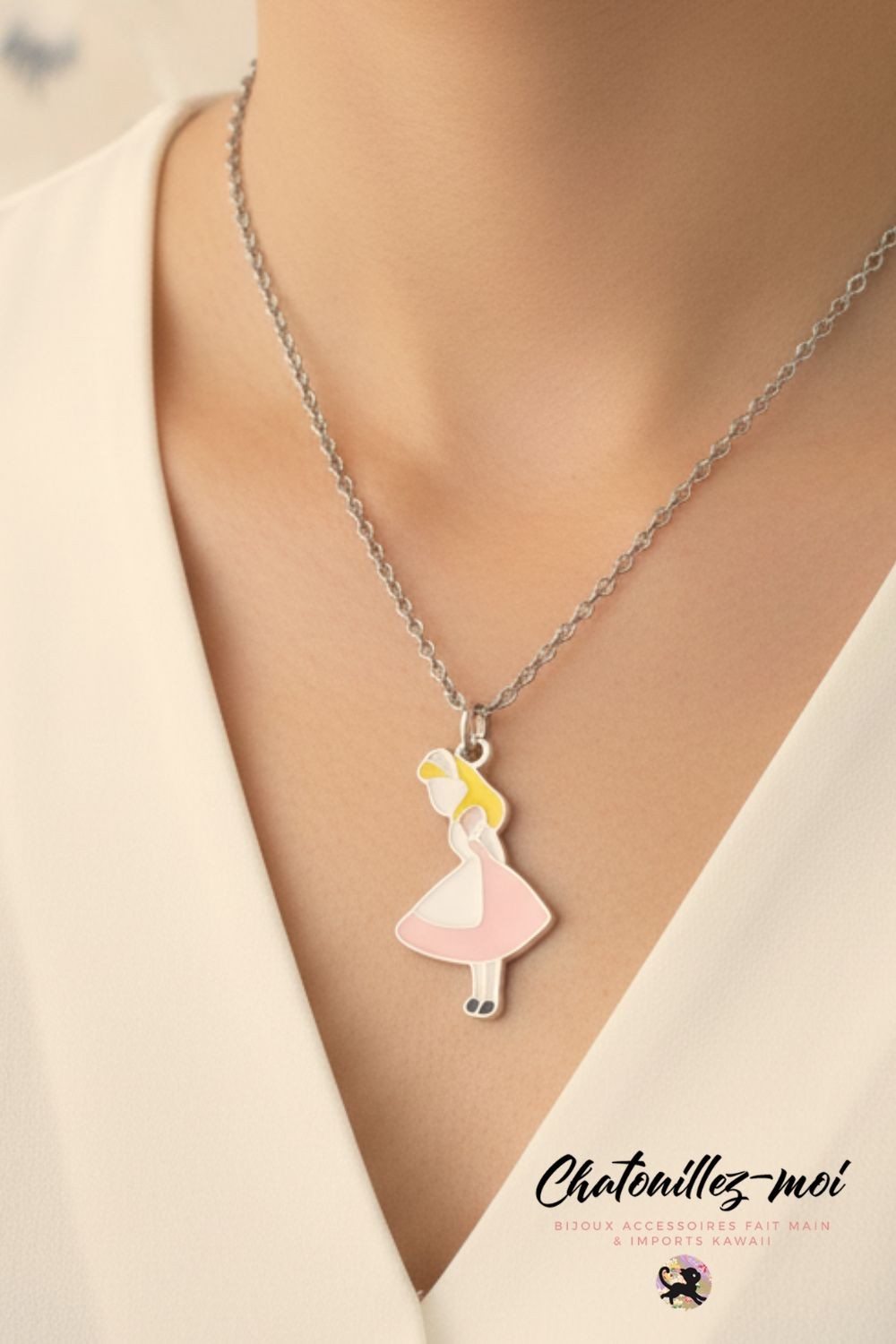 Plongez dans l’univers enchanteur d’Alice aux Pays des Merveilles avec ce collier raffiné. Son pendentif représente Alice en robe rose et tablier blanc, suspendu à une chaîne en acier inoxydable, pour un bijou délicat et élégant.
